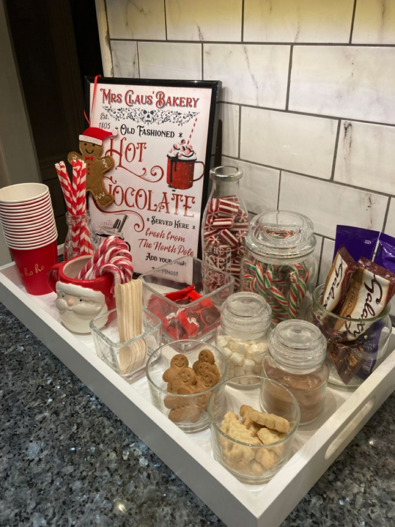 A charming cocoa bar can be achieved with warm, inviting details. Consider wooden crates, woven baskets, or vintage-style trays to create texture. Pair these elements with soft lighting and cozy fabrics like plaid or knit runners.