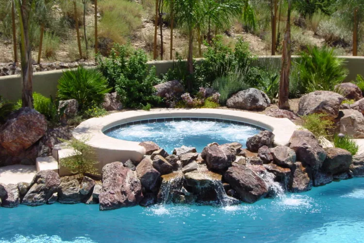 In Oro Valley, Arizona, a custom spa was built directly next to a swimming pool. Surrounded by natural boulders, it includes cascading waterfalls that spill into the pool, creating both visual appeal and soothing sound.