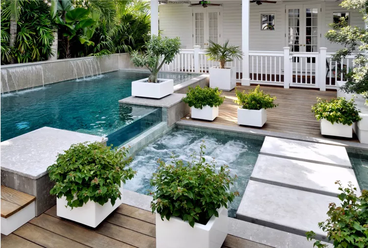 This Miami home’s outdoor space includes a covered patio, water features, and a swimming pool, with a hot tub set between two wooden decks. The spa doubles as both a relaxation spot and a connecting element in the landscape design.
