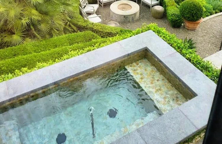 This round spa in Los Angeles demonstrates that hot tubs don’t have to be attached to pools. Built from concrete and decorated with blue mosaic tiles, it sits beneath a custom pergola with stylish outdoor furniture, creating a welcoming lounge area.