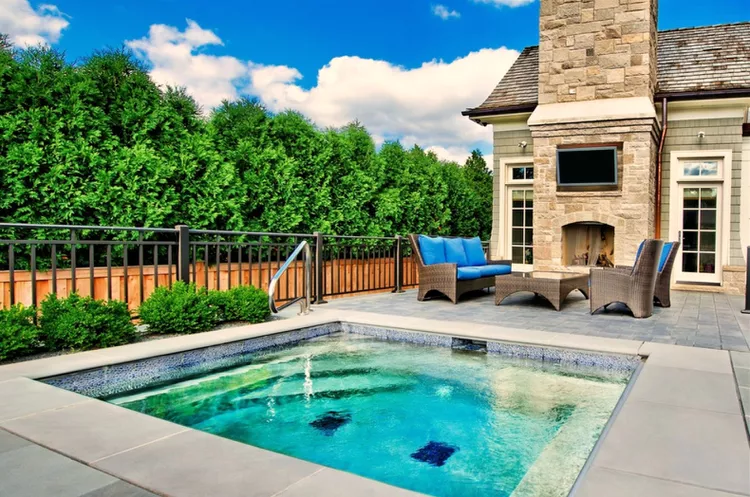 Separate from the main swimming pool, a plunge spa provides a private retreat. Designed with dark blue bluestone coping, this setup includes an outdoor fireplace and TV nearby, making it ideal for gatherings.