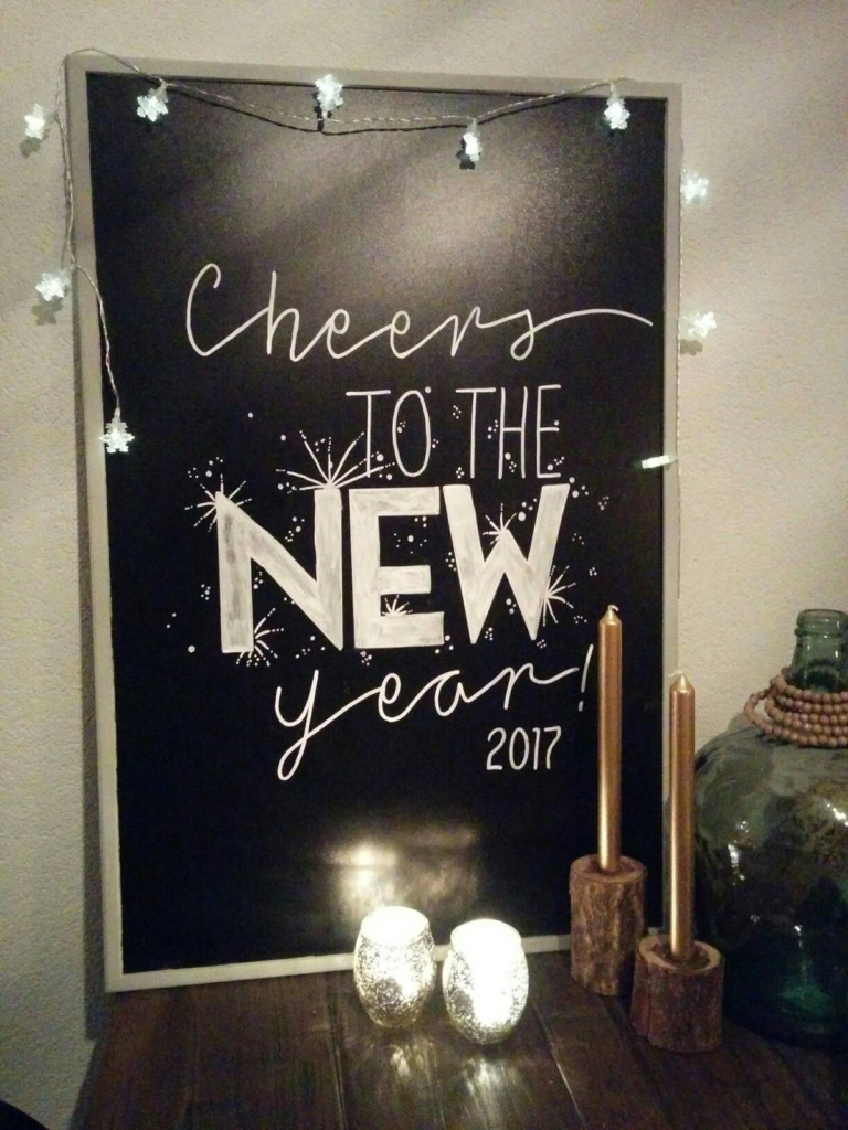 For a romantic and whimsical touch, this chalkboard idea captures the magic of New Year’s Eve. Use delicate lettering paired with heart or star accents to convey warmth and joy. It’s perfect for entryways, dining areas, or even bedroom corners where you want to celebrate the spirit of fresh beginnings. This design is charming, unique, and spreads positivity effortlessly.