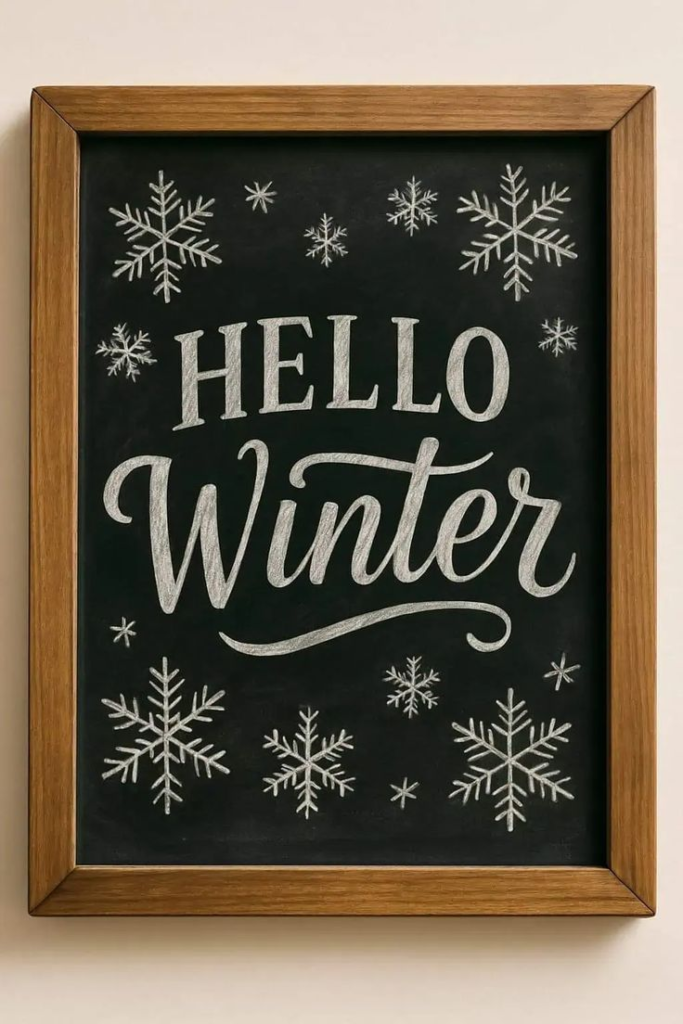 Kick off the season with a bold greeting that embraces all the beauty of winter. A “Hello Winter!” chalkboard can feature snowflakes, pine trees, or simple geometric accents to evoke the season. Place it in a central location for maximum impact—it’s a cheerful way to acknowledge the season while adding a decorative touch to your home.