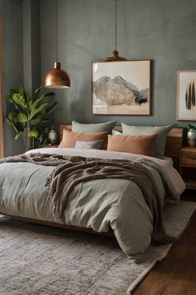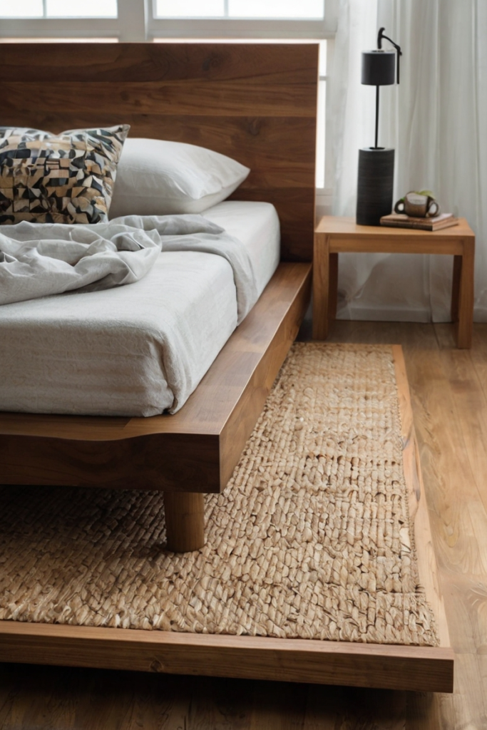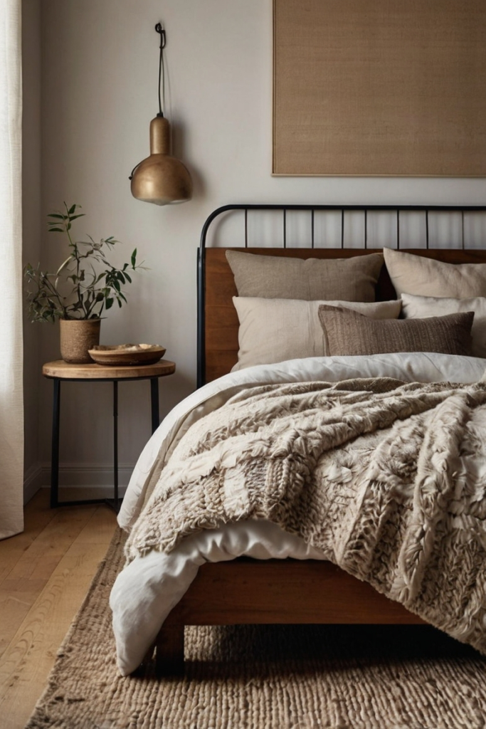 Ground the room with soft, natural-fiber rugs for warmth and texture. Use a large jute, sisal, or wool area rug to define the sleeping area. For added depth, layer a smaller rug—like a sheepskin or plush wool—on top.