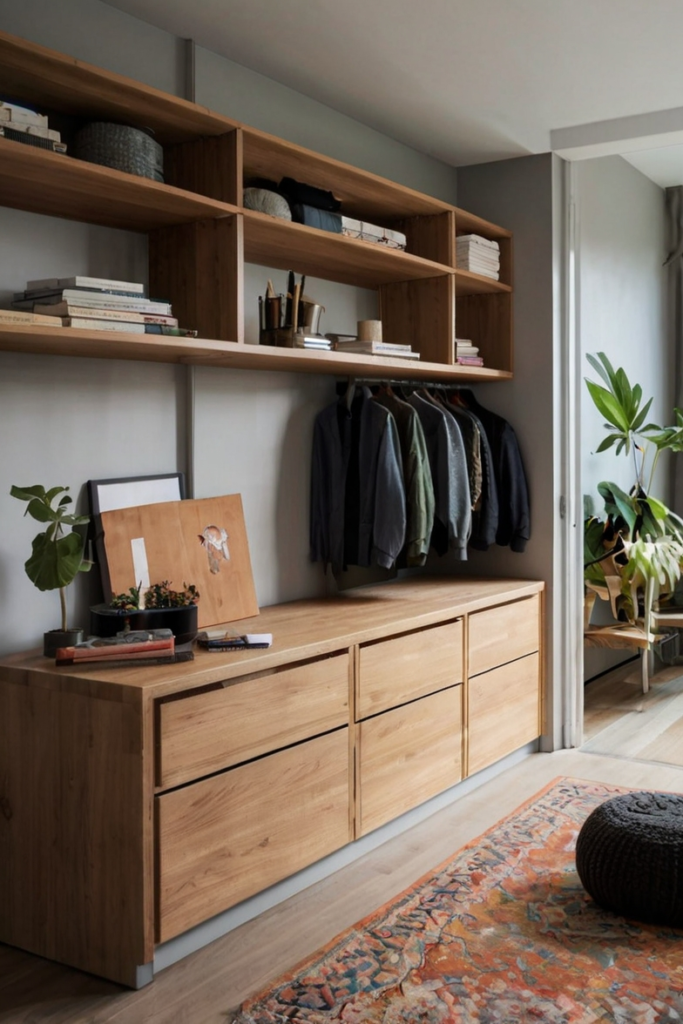 Japandi design values clutter-free spaces, which requires thoughtful, well-integrated storage. Opt for furniture with hidden functionality, like handleless dressers or beds with built-in storage.