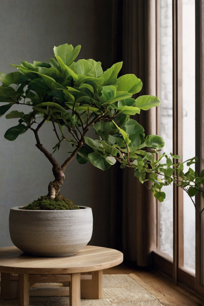 Nature plays a central role in Japandi design, but with restraint. Instead of a jungle of plants, choose one carefully selected element—a bonsai, a tall fiddle leaf fig in a simple pot, or a single branch in a vase.