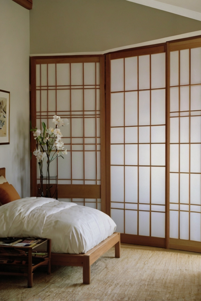 Shoji screens—translucent paper panels in wooden frames—can divide spaces and diffuse light. Freestanding screens can create a small dressing area, while sliding panels or frosted glass closet doors add privacy while allowing natural light to filter through.