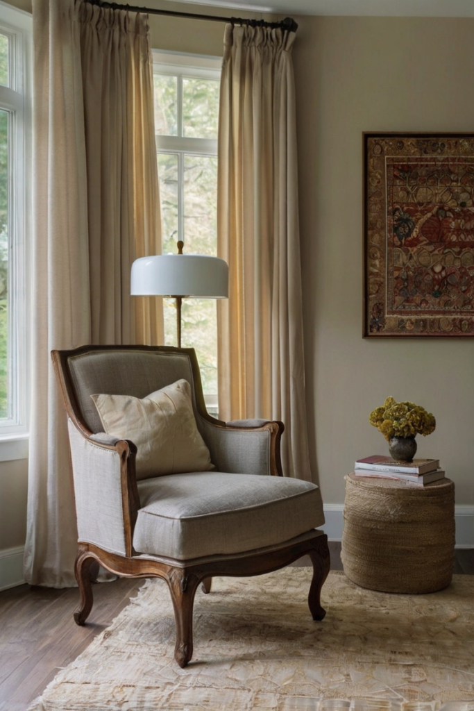 Create a small, dedicated corner for reading, reflection, or enjoying a cup of tea. Use a simple armchair in textured fabric like linen or boucle, paired with a small side table.