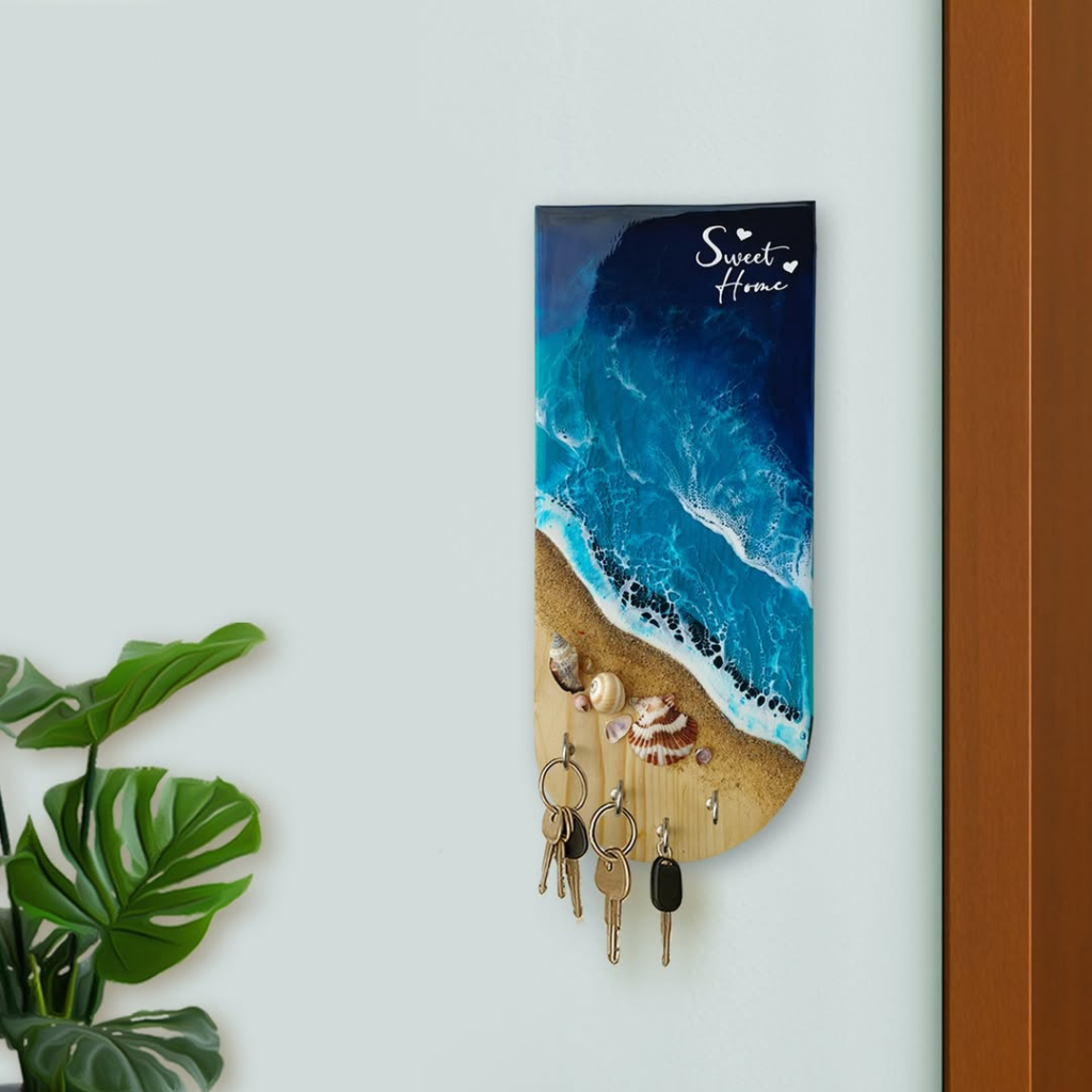 This coastal-inspired key holder captures the sea at home. Deep blues blend seamlessly into soft sand, accented with real shells for tactile charm. It’s more than functional—every glance evokes waves, sun, and salt air. Perfect for ocean lovers or anyone seeking serenity at the entryway, it effortlessly sets a calm, welcoming mood while keeping your keys organized and beautifully displayed.