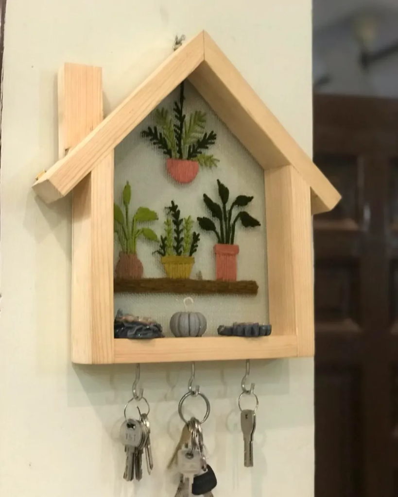 A tiny house frame with embroidered greenery transforms your keys into a charming miniature garden. Handmade detailing creates warmth, inviting a cozy, homely vibe. Perfect for entryways or kitchen nooks, it blends functionality with thoughtful craftsmanship. Each hook feels storybook-inspired, adding personality while keeping essentials in place. It’s small-scale decor with maximum heart and visual appeal.