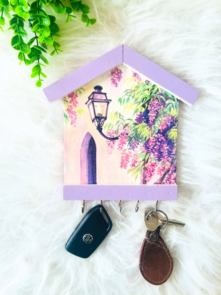Lilac tones, delicate florals, and a house silhouette create a fairytale-like key holder. Light, airy, and whimsical, it brightens corners while remaining functional. Ideal for vintage-inspired interiors, it combines charm with practicality. Each glance evokes serenity, offering a small escape at the entrance. Subtle, enchanting, and entirely delightful, it brings beauty and order to everyday routines.
