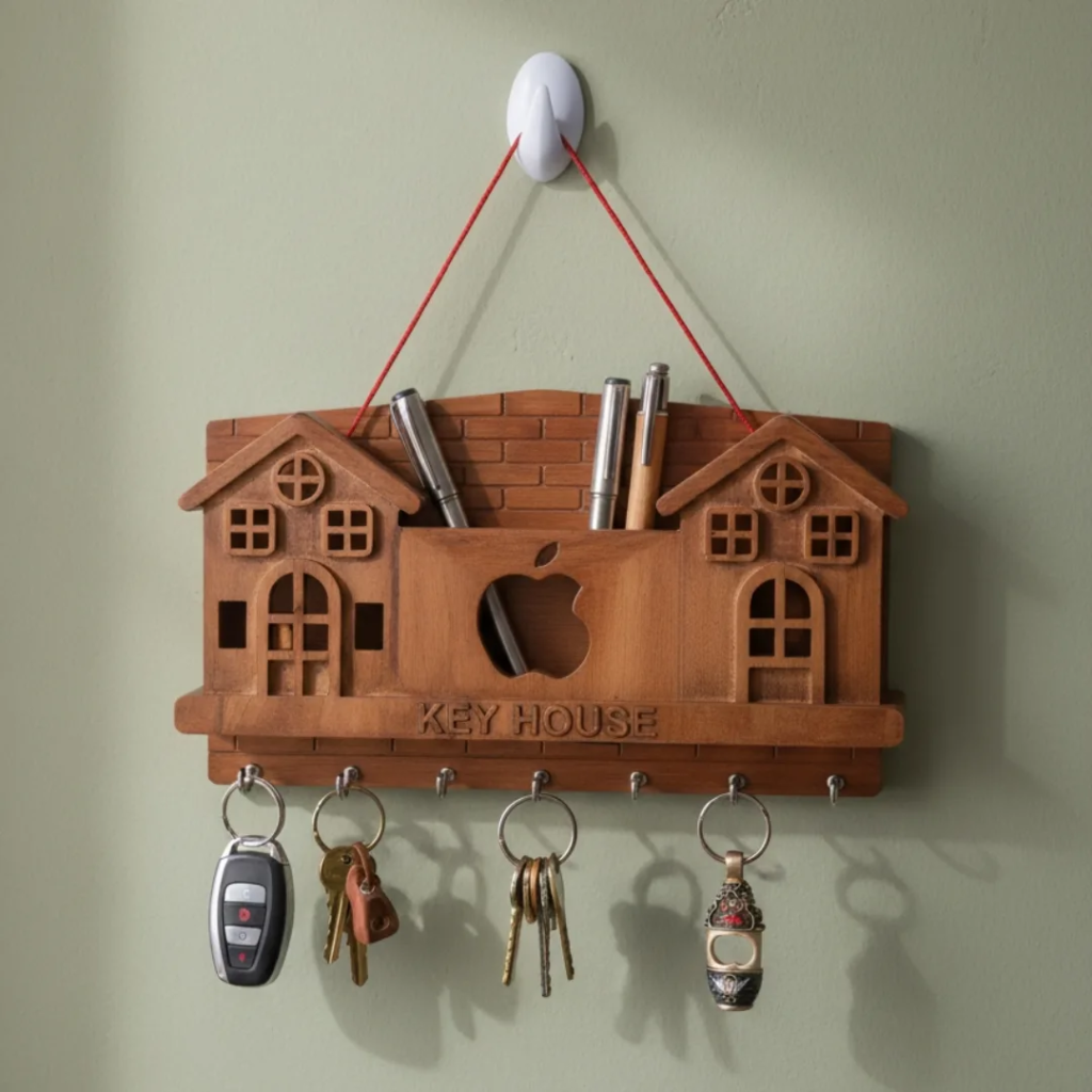 Playful twin-house cutouts with tiny apple details make this wooden holder both functional and charming. Hooks accommodate keys, while a small ledge adds storage for notes or pens. Its handcrafted energy evokes nostalgia and warmth. Versatile enough for modern or vintage settings, it brings personality and utility in equal measure, making daily routines feel thoughtful and enjoyable.