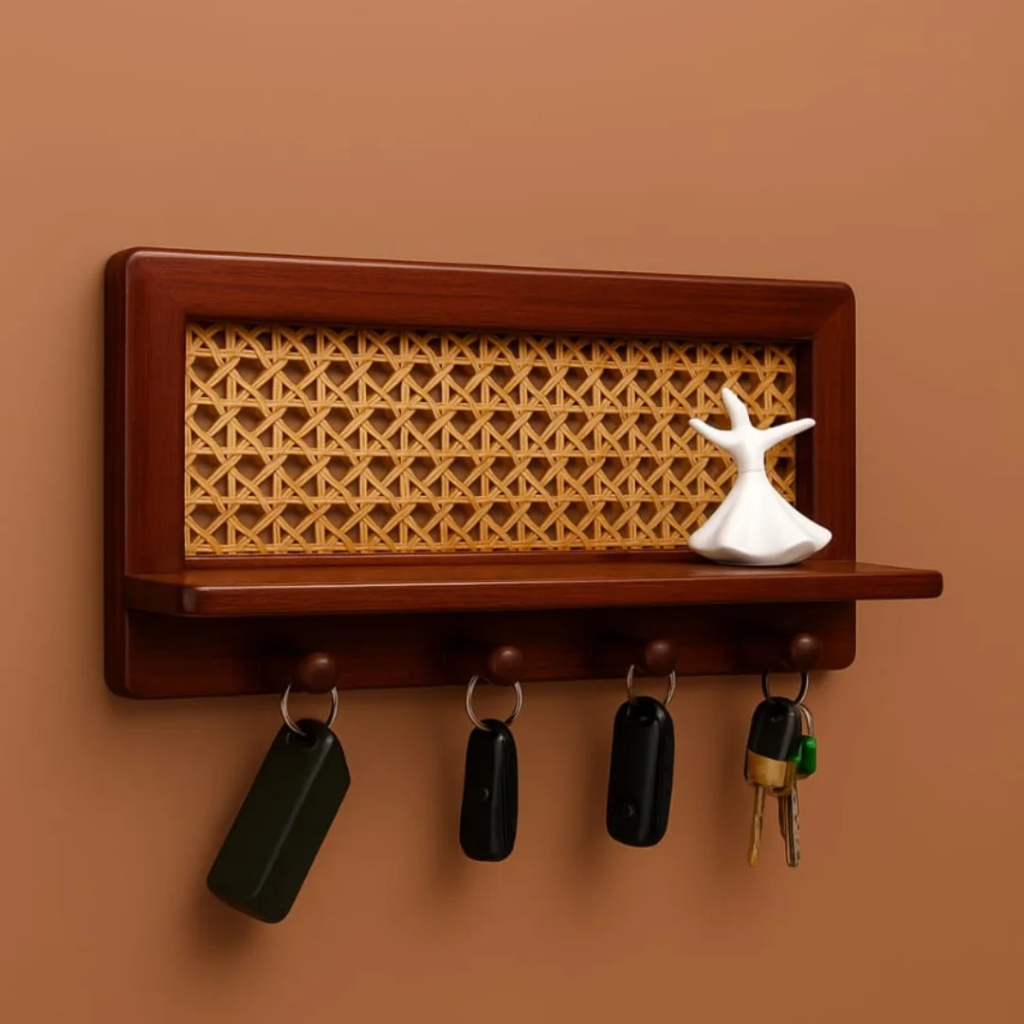 Woven cane panels and rich mahogany tones anchor this key holder in classic warmth. A tiny ceramic figure softens the structure, adding approachable charm. Perfect for cozy entryways, it balances vintage aesthetics with everyday practicality. The piece invites mindfulness, encouraging small rituals like lighting a candle or setting down keys with intention. Functional and heartwarming in equal measure.