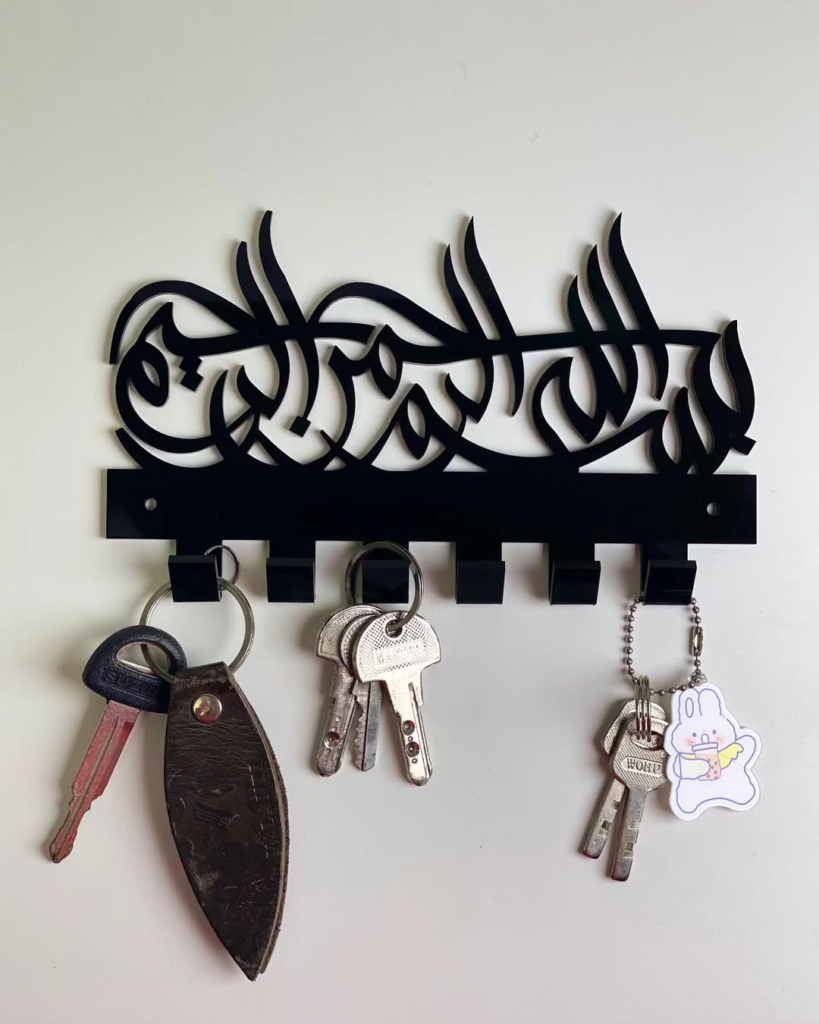 High-contrast Arabic calligraphy transforms this key holder into a statement piece. Black lettering against a white backdrop blends artistry with utility, making hooks functional yet unobtrusive. Ideal for homes that mix modern design with cultural grounding, it balances drama and practicality. Its elegance doesn’t overwhelm, offering a stylish, spiritual, and visually striking focal point for any wall.