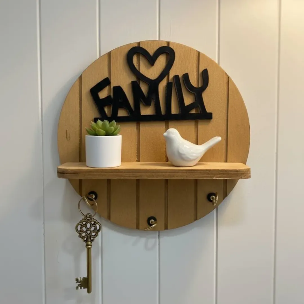 A round wooden panel with a tiny ceramic bird and “Family” cutout makes this key holder feel intimate and inviting. Its warm tones and gentle curves integrate easily into hallway or mudroom nooks. Functional hooks accommodate essentials while the design subtly encourages daily rituals. Homes gain charm and rhythm with this piece, merging practicality and gentle, rustic storytelling effortlessly.