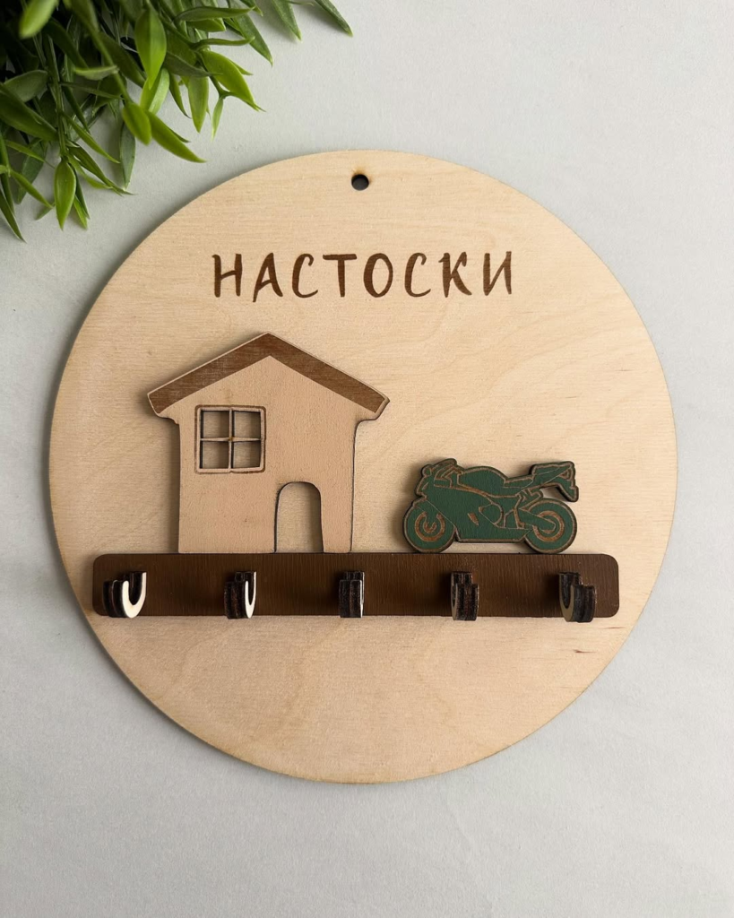House and motorbike cutouts create a playful, graphic statement on this lightwood key holder. Scandinavian minimalism meets warmth, providing four functional hooks without cluttering the design. Personalized engraved text adds character while keeping the piece approachable. Ideal for family homes or creative studios, it’s a cheerful, unobtrusive accent that blends everyday utility with understated joy.