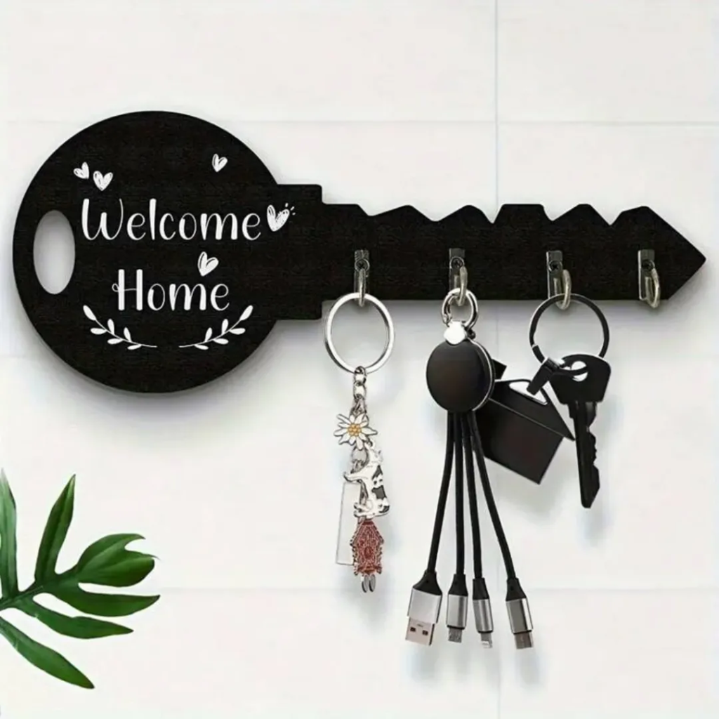 Oversized key silhouette with “Welcome Home” lettering adds humor and heart to an entryway. Six sturdy hooks provide organization, while whimsical fonts and small hearts create warmth. Perfect for busy households, this design blends function and charm. It’s playful without crossing into kitsch, ensuring keys are both accessible and part of a welcoming, lighthearted wall display.