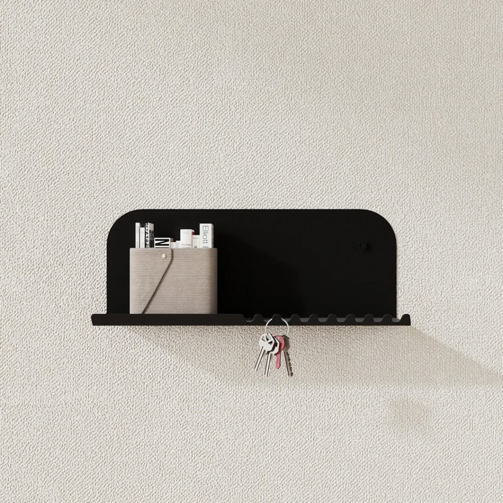 Matte black design with soft curves elevates keys into sculptural elements. Minimal yet functional, it doubles as a shelf for small essentials. Ideal for modern, design-conscious spaces, it blends negative space and utility seamlessly. Keys appear as part of a curated vignette, offering quiet sophistication. This piece proves that even everyday objects can be both practical and visually compelling.