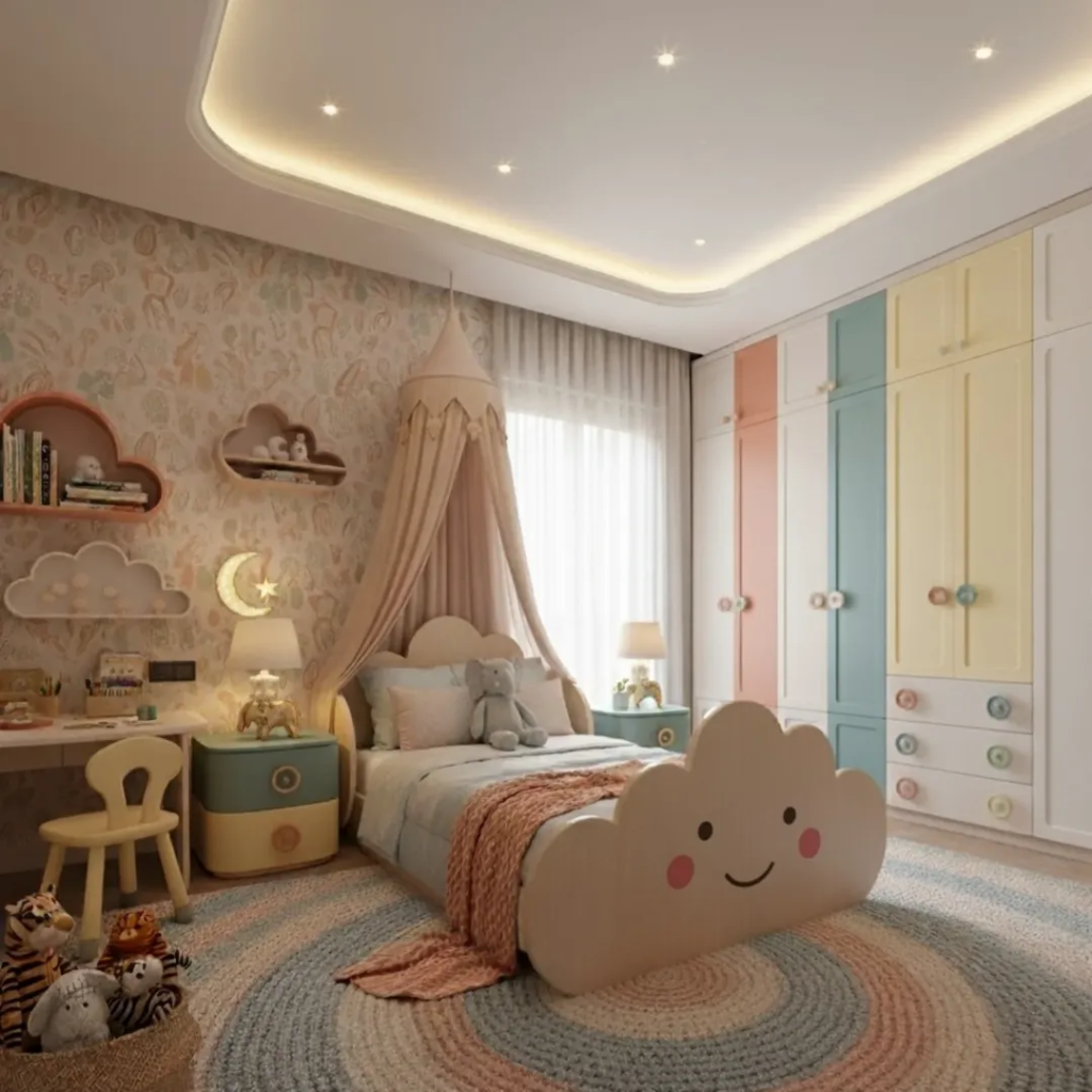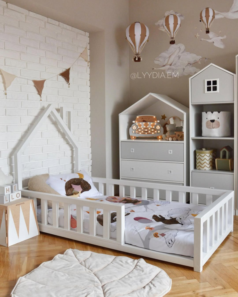 This bedroom sparks imagination while remaining serene. Soft neutral shades set a calming tone, while whimsical cloud accents and miniature hot-air balloons add playful charm. The design is lively yet gentle, giving children a space to explore creativity without overwhelming their senses. The balance is key—every element is purposeful, creating a room that can grow with the child and avoid frequent redesigns.