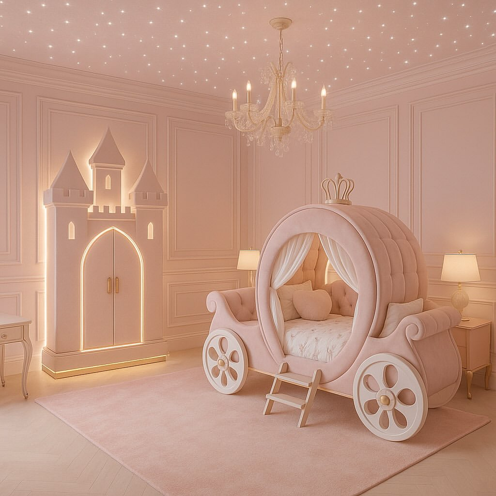 Soft blush tones, gentle florals, and canopy details create a dreamy, storybook atmosphere. The neutral foundation and clean-lined furniture prevent the space from becoming overly themed, making it timeless. This bedroom blends whimsy with practical design, offering a magical yet functional retreat for children.