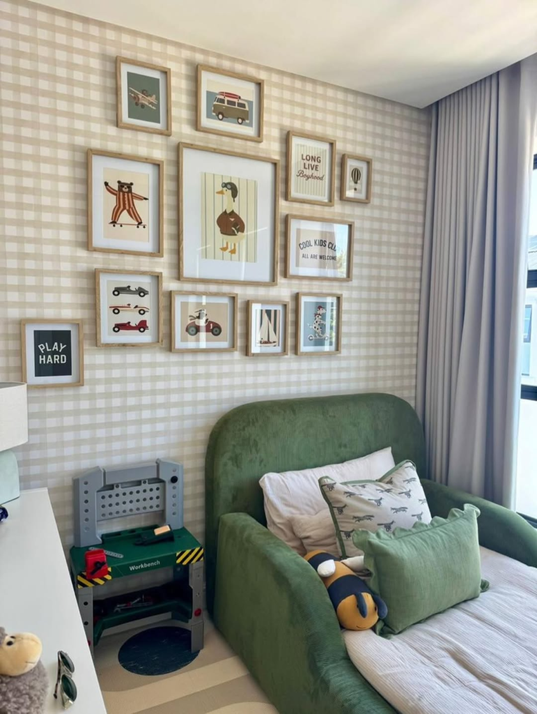 Muted sage tones, natural wood, and low-profile furniture combine to create a gentle, grounded space. The room allows for both play and rest without feeling precious or delicate. This design emphasizes longevity, offering a practical environment that nurtures creativity while remaining calm and functional for everyday life.