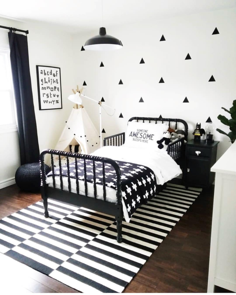 High-contrast black-and-white patterns and structured furniture give this kids’ room confidence and personality. Small hints of softness prevent it from feeling too mature. This bold approach creates an energetic, stimulating environment while remaining fun and age-appropriate. It’s proof that kids’ rooms can embrace strong design choices successfully.