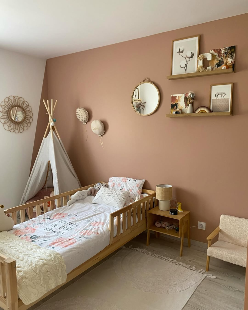 Muted pink walls, carefully curated shelving, and soft textures create a room that grows with the child. Design elements are timeless and adaptable, ensuring the space remains charming as the child ages. It’s sweet yet sophisticated, offering a bedroom that feels comfortable now and beautiful for years to come.