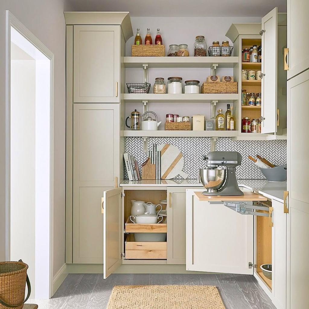 Tiered shelving is the secret weapon here. Baking dishes, lids, bowls, and even larger appliances coexist peacefully, each item accessible and visible. It’s a functional ballet: everything has its space, nothing is buried, and it creates a sense of calm order. This solution proves that smart design allows even the bulkiest items to feel intentional and stylish.