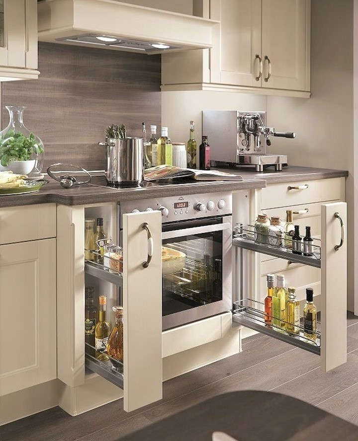 Vertical spice pull-outs make the most of narrow kitchen spaces. Sleek, efficient, and easy to access, these compartments keep herbs and spices visible and orderly. Even compact areas benefit from this approach, proving that clever vertical solutions can enhance storage without crowding the design.