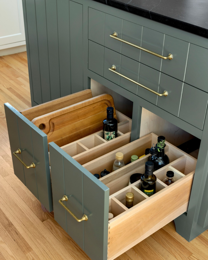 Layered compartments allow oils, cutting boards, and kitchen tools to live harmoniously within sleek drawers, complemented by subtle brass hardware. The result is a seamless combination of beauty, practicality, and understated drama—a kitchen that feels alive yet organized.
