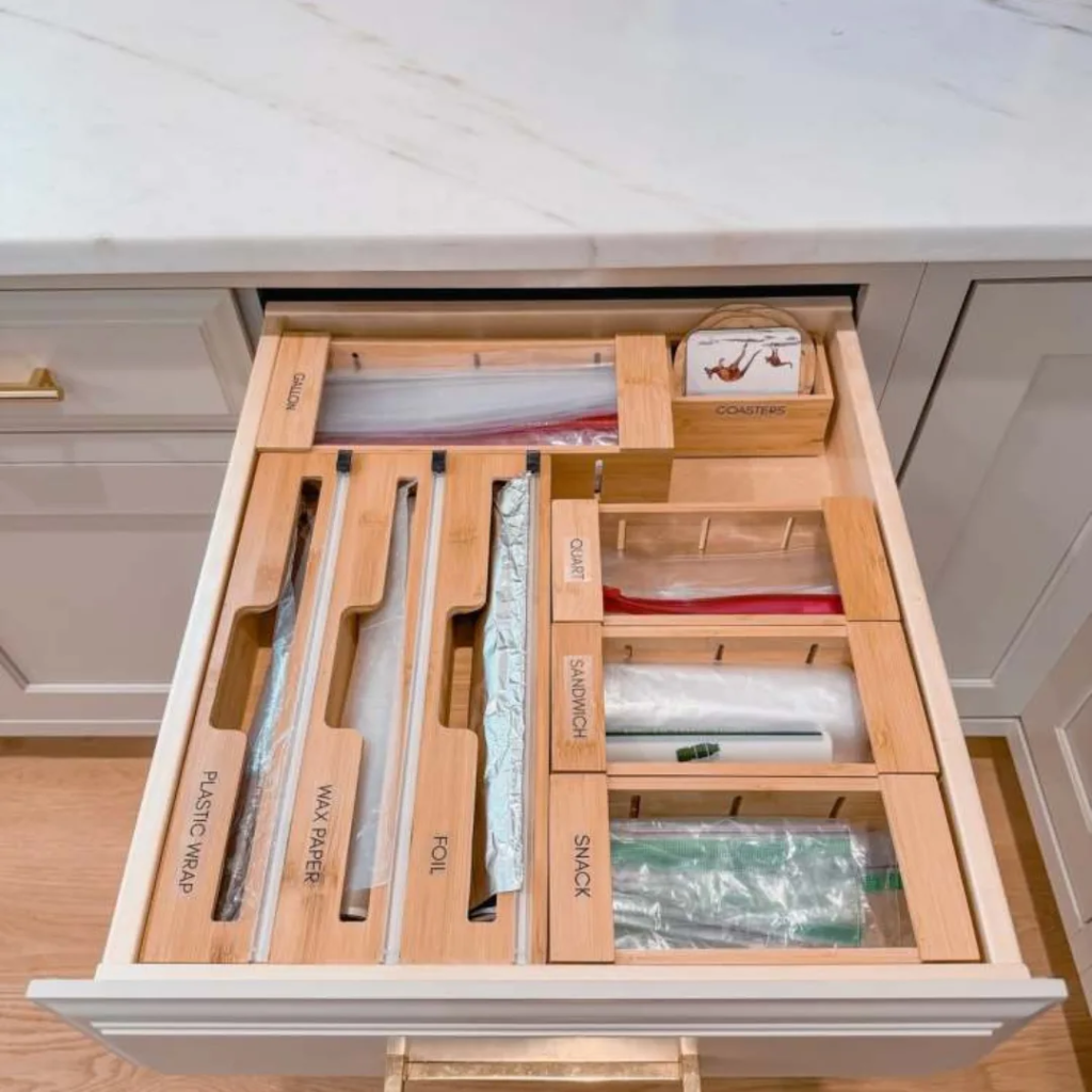 Drawer dividers transform storage into a high-end experience. Ziploc bags, snack pouches, and small kitchen items all have a proper home, proving that attention to detail can make everyday tasks feel elevated. Even simple actions, like packing lunch, become a little more glamorous in this thoughtfully organized space.