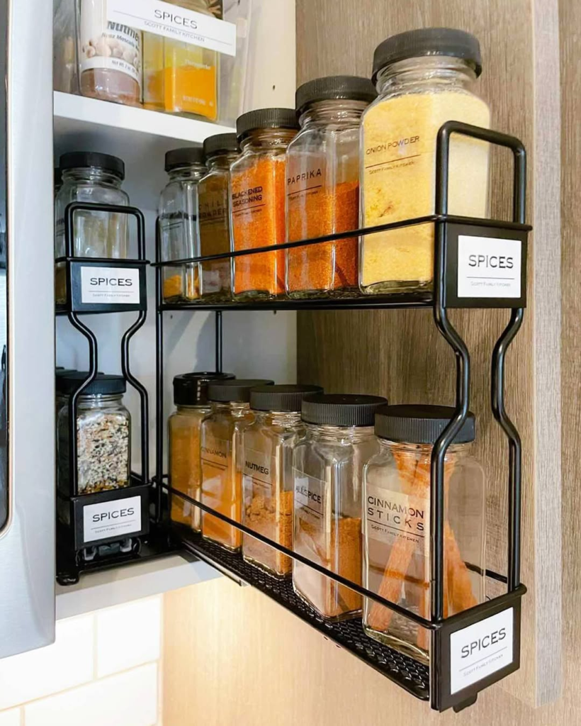 Symmetrical, labeled, and orderly spice shelves offer instant visual satisfaction. Open the cabinet, and even the busiest chef feels a sense of control. The combination of accessibility, style, and precision turns a basic spice rack into a central feature of a well-organized kitchen.