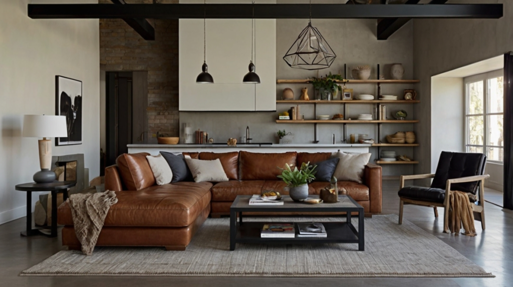 A rich leather sectional anchors this loft-style living room, creating an inviting and grounded focal point against exposed beams and a soft, neutral kitchen backdrop. The leather adds warmth and visual weight while maintaining the openness of the layout.