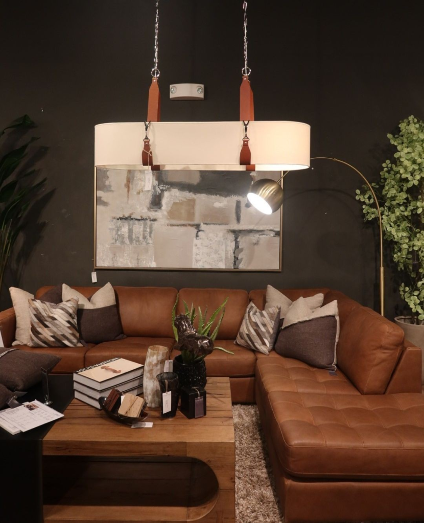 Deep walls and statement lighting create a dramatic backdrop for a bold leather sectional in this urban lounge. The rich leather balances the darker palette, adding warmth and depth so the space doesn’t feel flat.