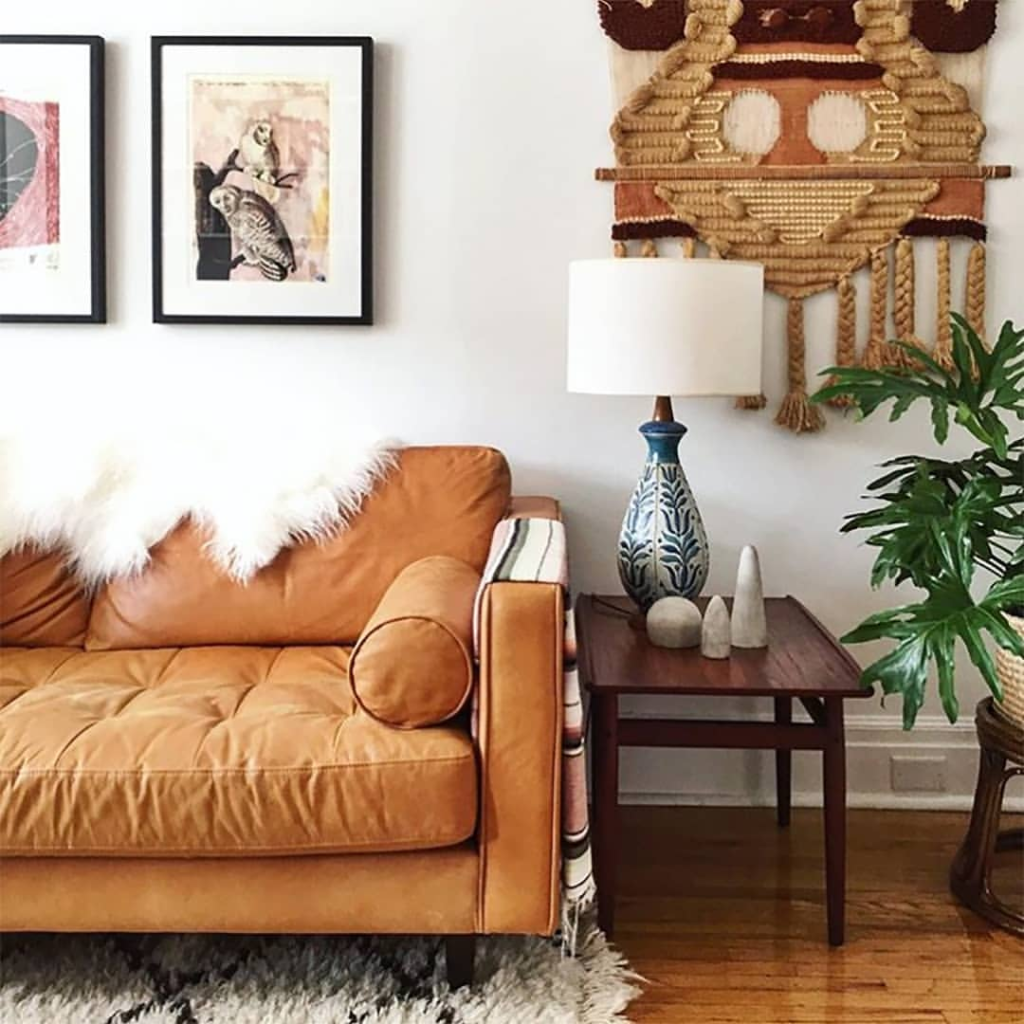Texture takes center stage in this boho-inspired living room. A caramel leather sofa pairs beautifully with woven wall art, indoor plants, and neutral accents, balancing structure with relaxed styling.