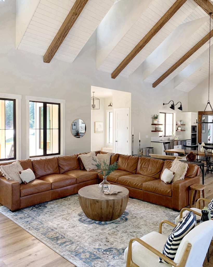 Vaulted ceilings and pale wood floors create a sense of openness, with a leather sectional grounding the living area. The sofa adds warmth without feeling heavy, while the bright and airy backdrop keeps the room fresh.