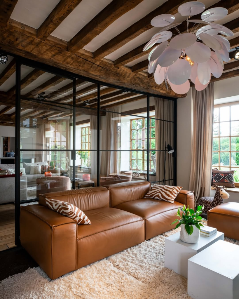 Exposed beams and glass partitions highlight a mix of rustic and modern design elements. A leather sofa softens architectural lines, adding warmth and grounding the space without competing with its structural features.