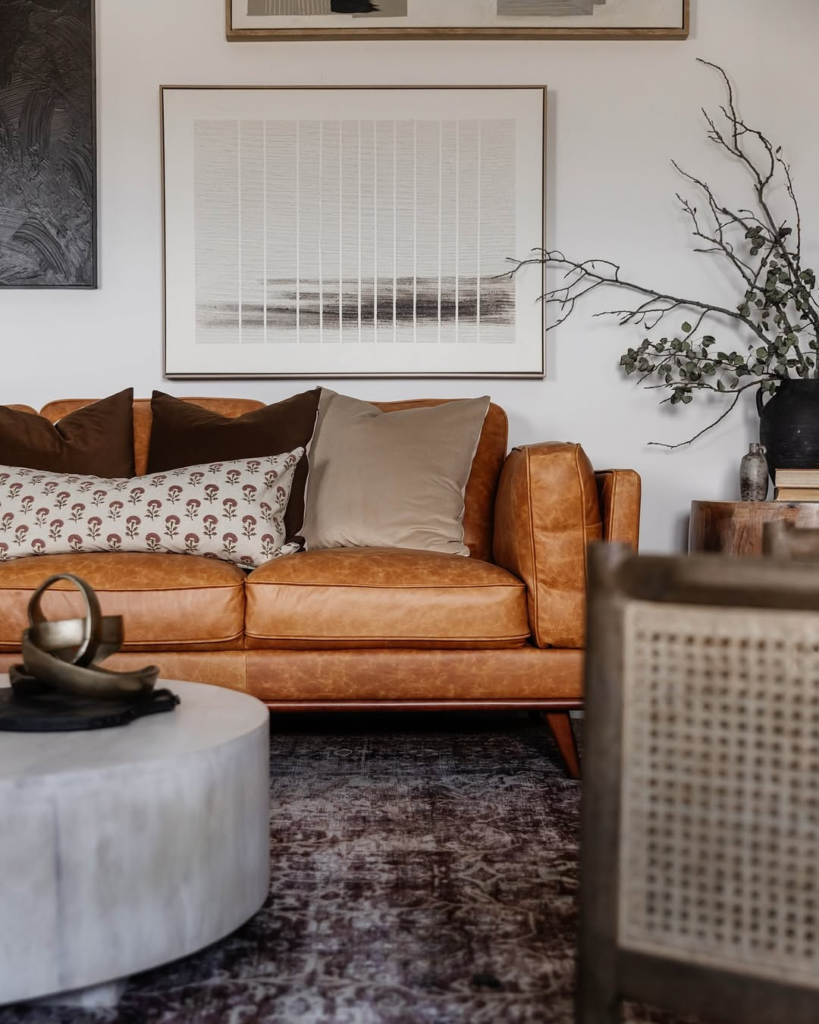 A well-loved leather sofa sets the tone for a personal, relaxed living space. Layered textiles and thoughtfully curated décor pieces give the room character and narrative, making it feel truly lived-in.