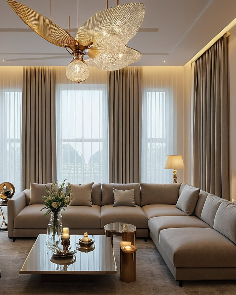 A central sculptural chandelier becomes an unmistakable focal point. Bold and artistic, it energizes the room without feeling cold or impersonal. Ambient lighting layers ensure the space remains comfortable and approachable.