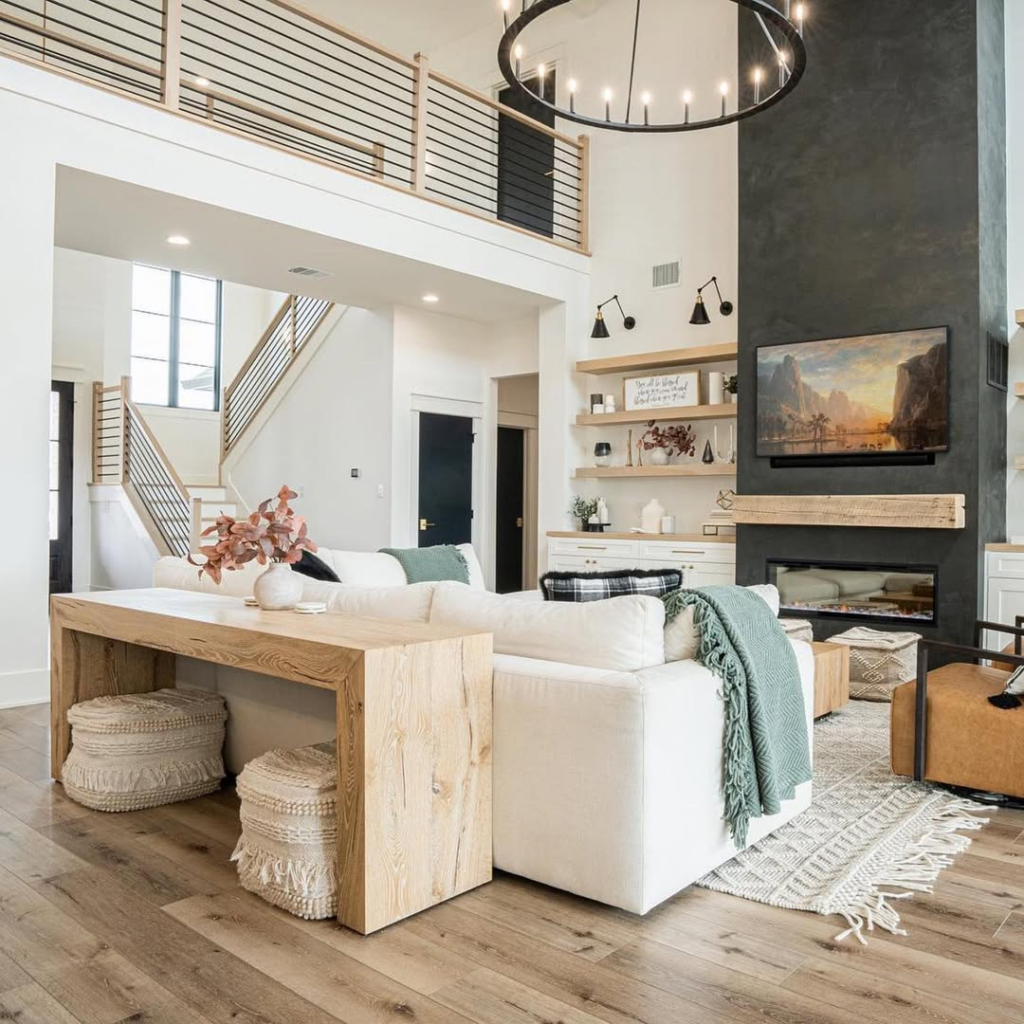 Earthy woods, soft furnishings, and layered neutrals create a living room that feels grounded and serene. Rustic elements are polished enough to feel intentional rather than overwhelming.