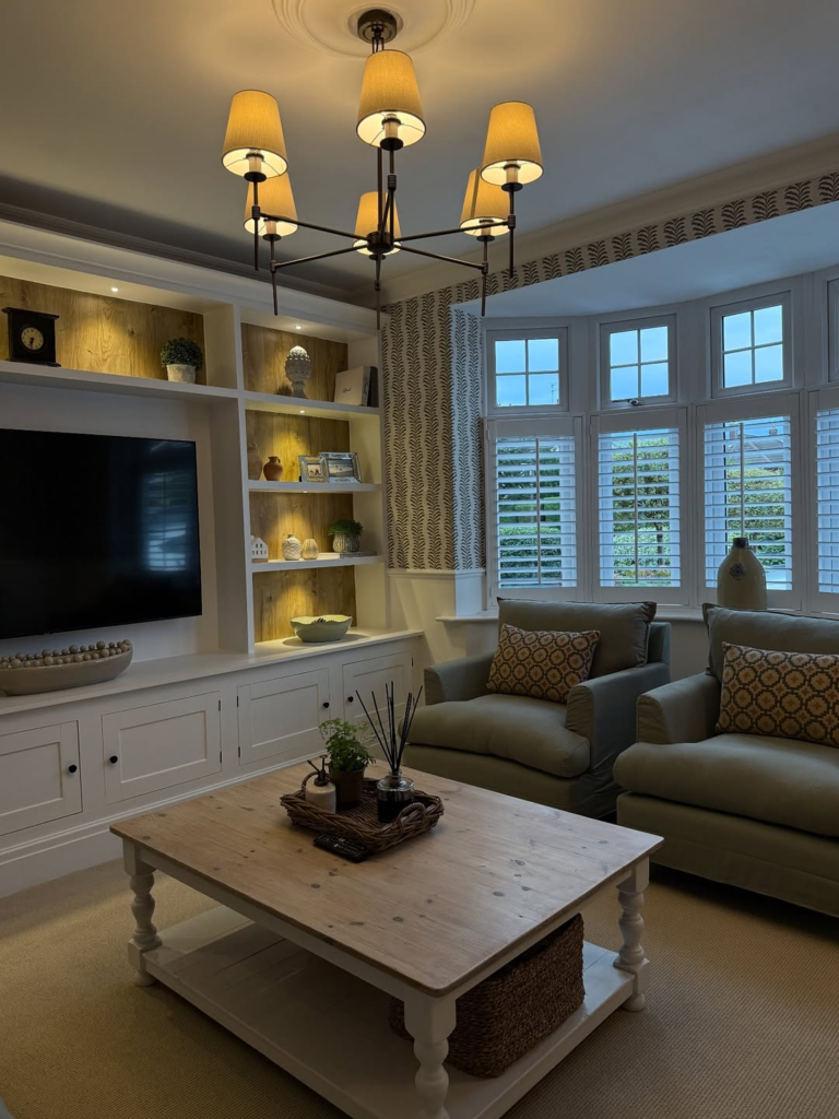 Balance is the key here. Lighting supports the warm, comfortable aesthetic without competing for attention. Every fixture feels considered, making the room feel inviting, relaxing, and thoughtfully designed.