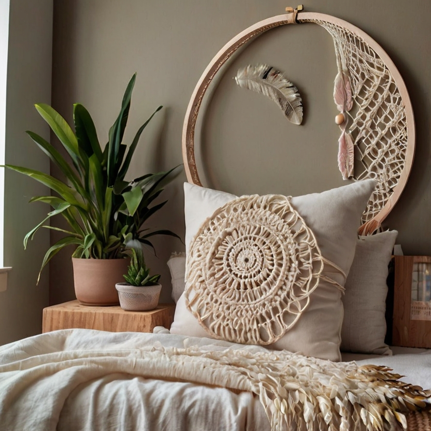 For a whimsical touch, a macramé hoop decorated with feathers combines elegance with playfulness. The circular structure provides an alternative to traditional linear wall hangings, while the soft feathers add lightness and texture.
