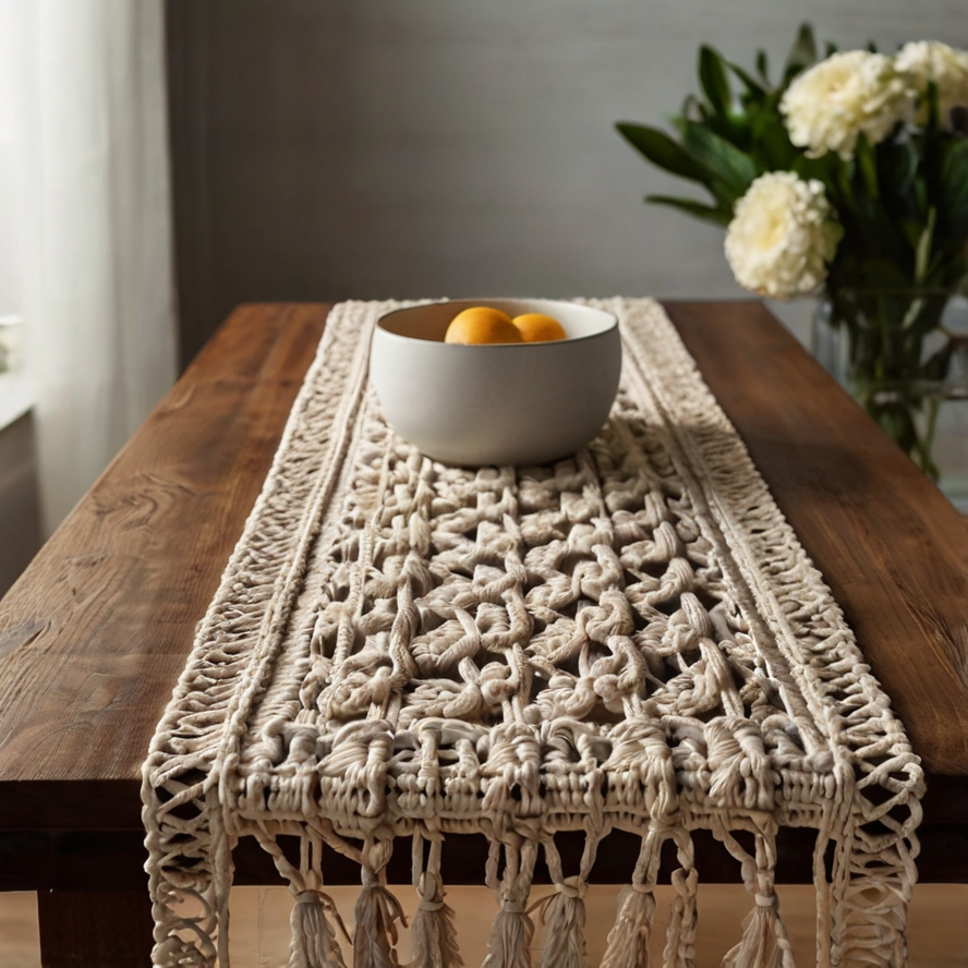 A macramé table runner brings a handmade, rustic charm to any dining setup. Intricate knotting paired with flowing tassels adds visual interest and depth, creating a tactile contrast with sleek tableware.