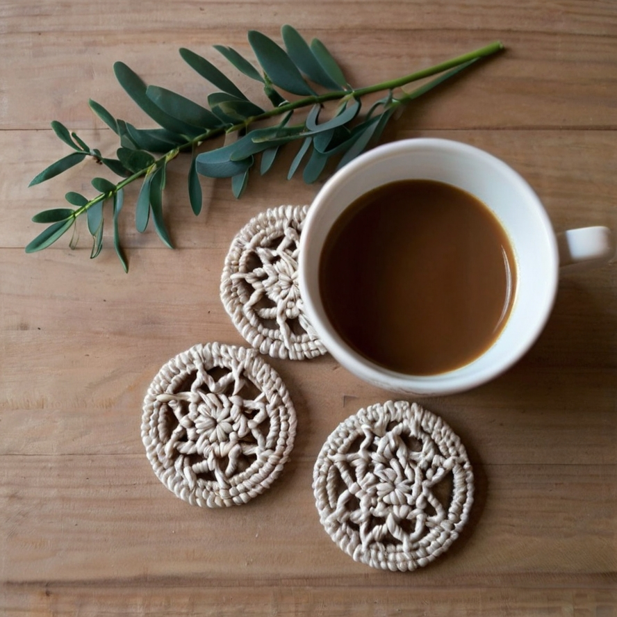 Macramé coasters are simple yet stylish additions to a coffee table. Circular designs with radial knot patterns and subtle fringe create visual appeal while maintaining practicality.
