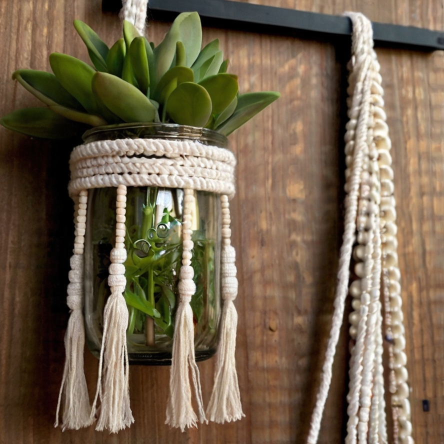 Transform ordinary mason jars into stylish storage or planters with a macramé jar holder. The design combines simple knots with optional beads, adding subtle texture while keeping the piece light and airy.