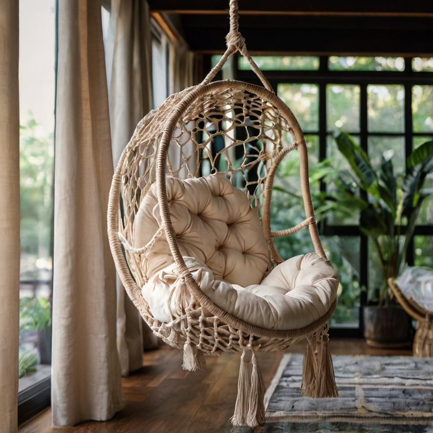 A macramé hanging chair combines comfort with visual appeal. Diamond knots and long tassels create a striking boho-chic centerpiece for indoor or outdoor relaxation.