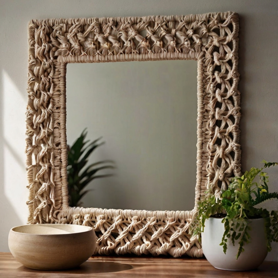 A macramé mirror frame transforms a simple mirror into a statement piece. Detailed knots and flowing fringe soften edges while adding artisanal texture.