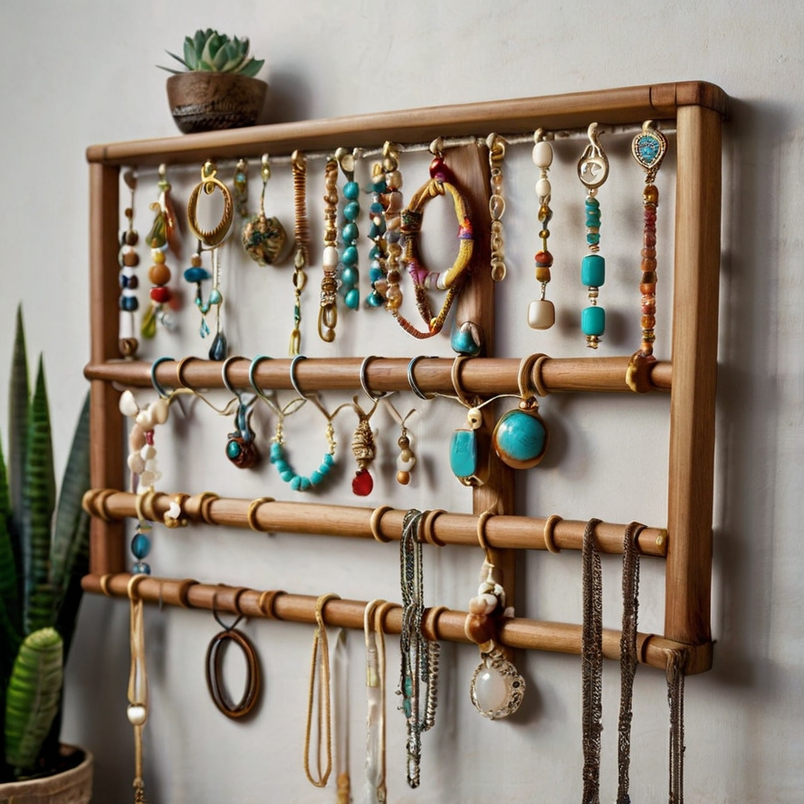 A macramé jewelry organizer doubles as art and storage. Loops and rods keep necklaces and earrings organized while enhancing room decor.
