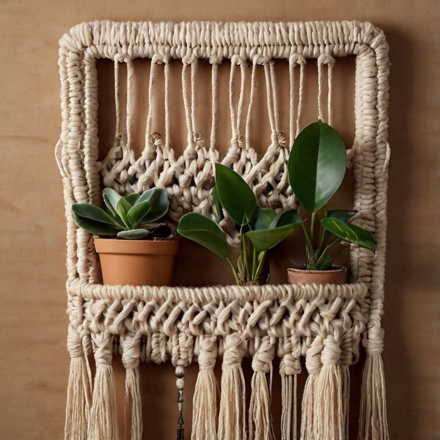 A macramé wall organizer with pockets provides practical storage for keys, mail, or small items. Sturdy knots and fringe make it stylish while functional.