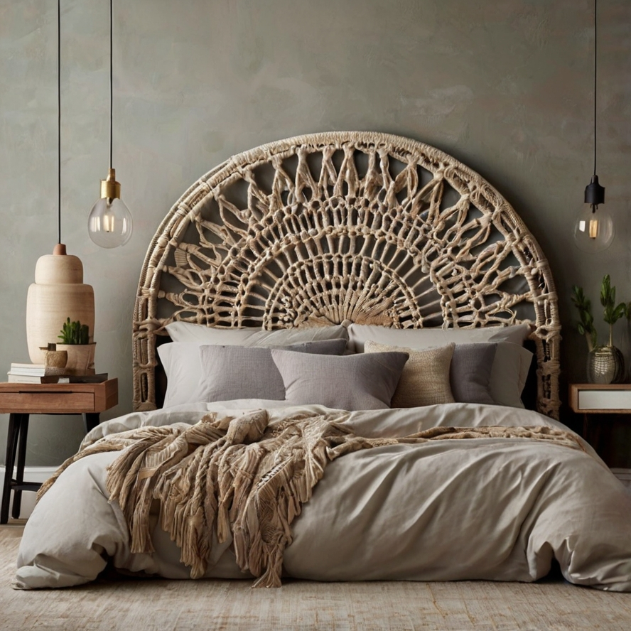 Macramé headboards create a serene focal point in the bedroom. Arched patterns and long fringe offer depth and texture, while driftwood adds a natural element.